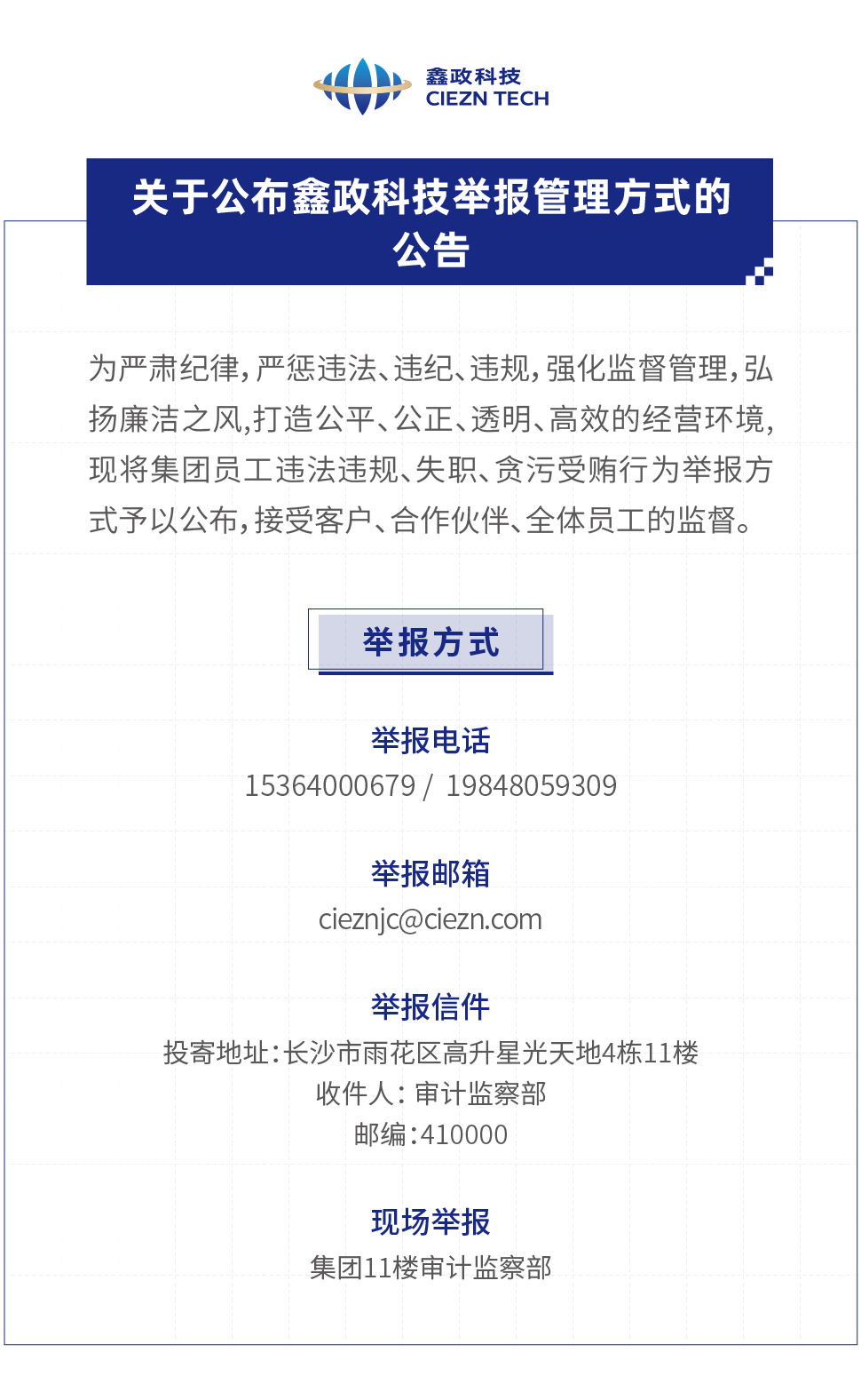 關于公布鑫政科技舉報管理方式的公告